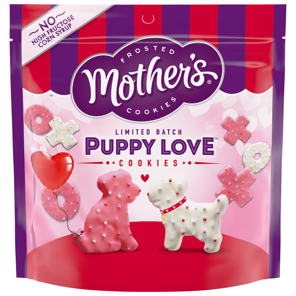 The season of love is here! Make Valentine's Day even sweeter with limited batch Mother's Puppy Love Cookies. Inside each bag are irresistible shortbread cookies, coated in pink and white frosting, and dotted with red, pink and white sprinkles. These delicious cookies are shaped like X's and O's and the most adorable puppy shapes, too! Perfect for sharing and snacking or even decorating your baked treats to add a sweet touch to top off your desserts.